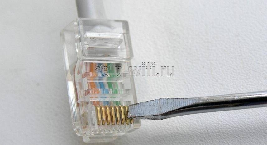 Процесс отличаться будет, отсутствием специального инструмента, для обжима. Вам не придется делать ненужные затраты, покупать клещи, ради того чтобы пару раз обжать кабель с rj 45. Заключается метод в том, что функцию кримпера у нас выполнит отвертка или обычный нож. После того как все жилы будут вставлены, берем отвертку и прикладываем его к металлическим контактам на коннекторе, слегка придавливаем. Так нужно будет сделать с каждым контактом.