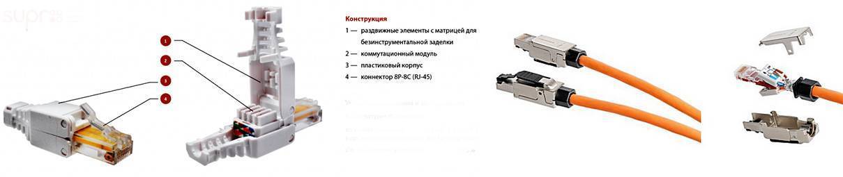Существуют самообжимающиеся коннекторы, не требующие для обжима витой пары из 8 жил других инструментов, кроме используемых для удаления оплетки и изоляции.