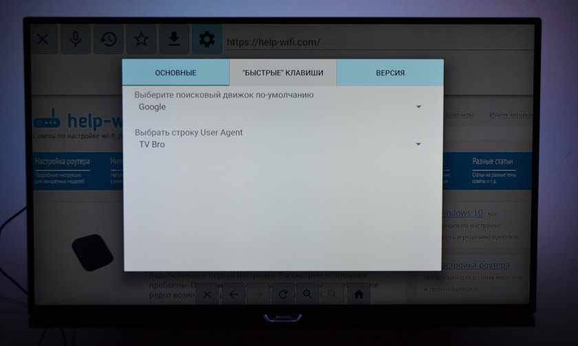 В настройках TV Bro можно сменить поисковую систему и User Agent браузера. Там же можно назначить быстрые клавиши и посмотреть версию установленного браузера.