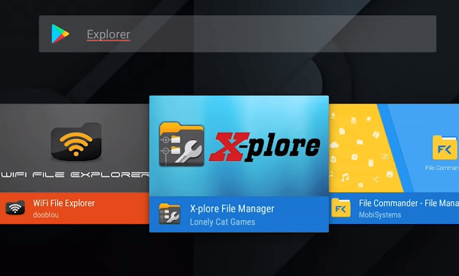 - Откройте на приставке Google Play Store, найдите через поиск и установите приложение File Commander. Можно так же использовать X-plore, или другой файловый менеджер.