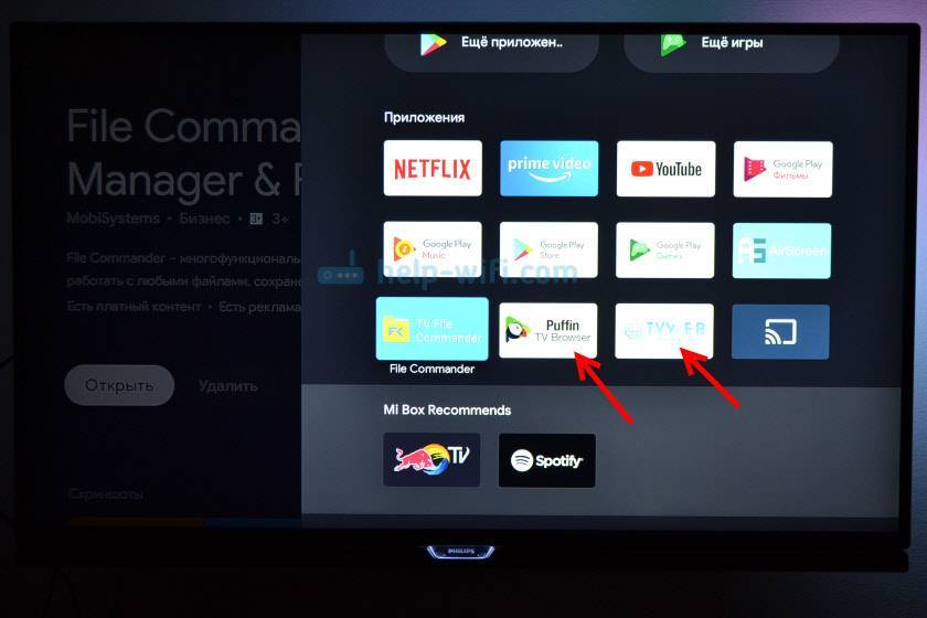 Из Play Маркет, или через .apk файл файл можно установить браузер для просмотра сайтов. Я об этом писал в статье как установить браузер на Xiaomi Mi Box S или другую Android TV приставку. В официальном магазине приложений на Android TV доступны два неплохих браузера: Puffin и TVWeb Browser.