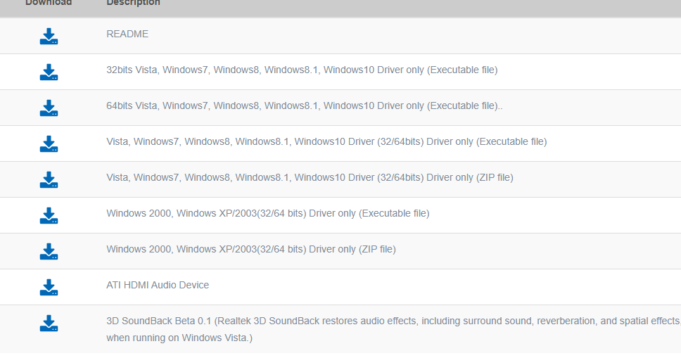 Здесь показаны все категории звуковых драйверов. Скачать их можно по нажатию любой из ссылок под надписью Download. Выберите подходящую версию, затем нажмите на скачивание. Вот и все!