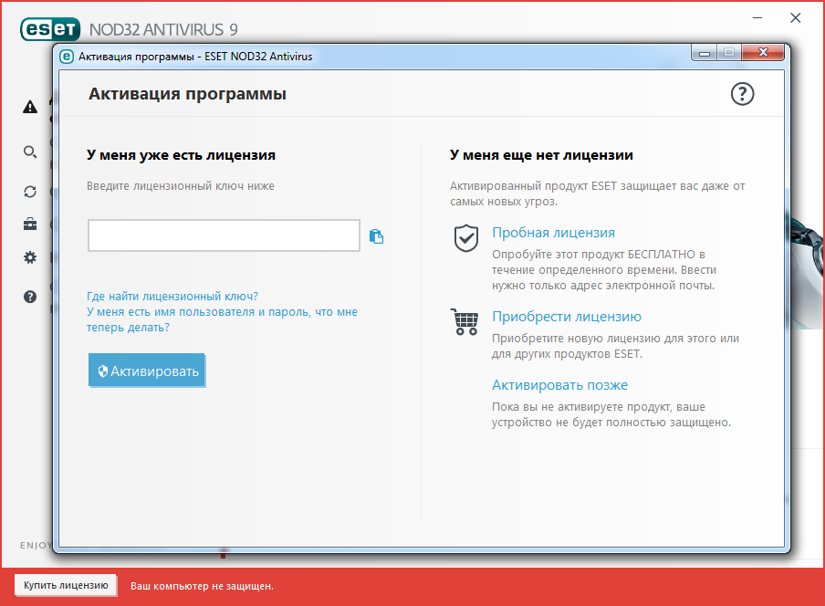 Если у вас нет свободного времени или вам просто лень, то можно приобрести лицензию в интернете. Для этого заходим в антивирус и переходим в правый нижний угол — Лицензирование.