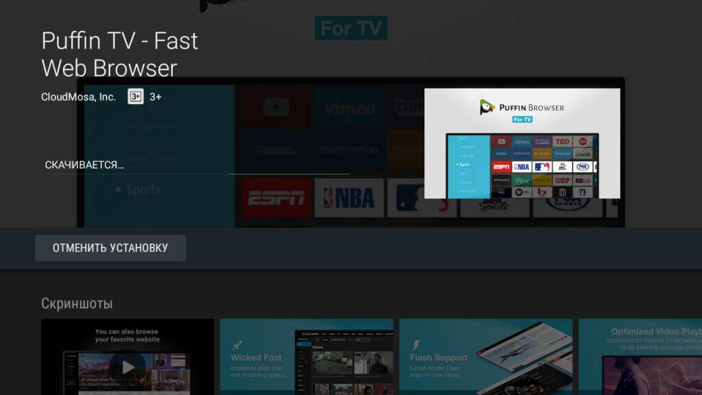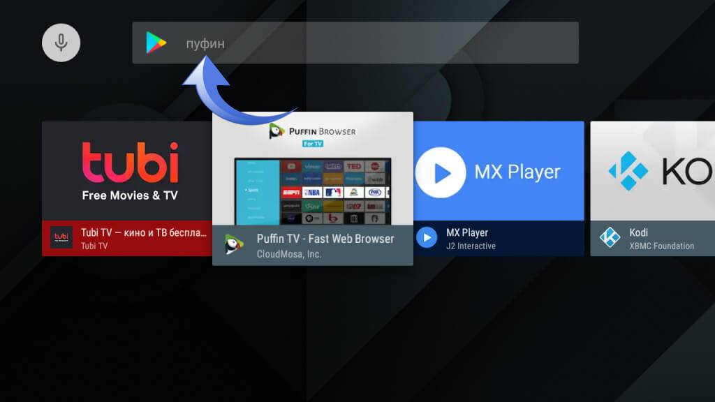 Затем нажмите на изображение увеличительного стекла и введите «Puffin«это веб-браузер для твоего телевизора Сяоми Ми.