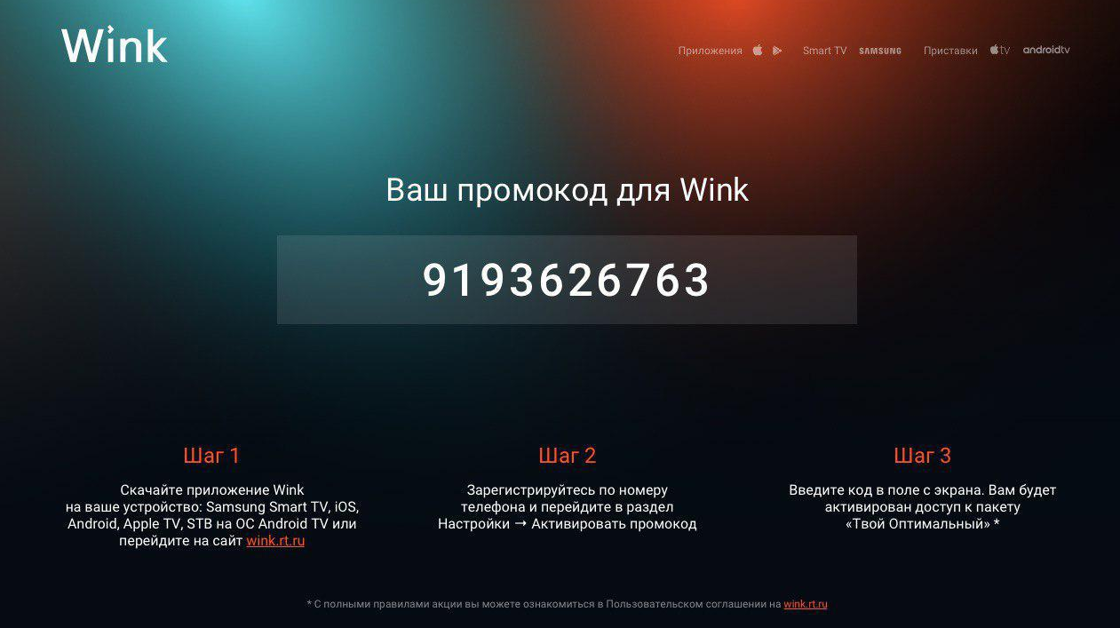 Промокод на 1 год выдается в рамках акции «ТВ-онлайн» для абонентов Интернета (части пакетов) и абонентов сотовой связи Ростелеком. Сам промокод отображается в Едином личном кабинете (lk.rt.ru) или при наборе USSD-команды с вашего номера телефона. Если вы являетесь абонентом сотового оператора Ростелеком, то вам нужно набрать команду *100*389*1# с телефона для получения промокода. Так же промокод положен тем, кто использует услугу «Интерактивное ТВ» — им так же доступен бесплатный Wink.
