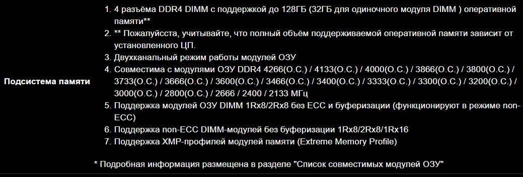5-6. Пятый и шестой пункты пригодятся при подборе оперативки к уже установленным модулям. В нашем случае поддерживаются все типы модулей памяти, кроме ECC (серверная память с коррекцией ошибок)Серверная память, которая не подходит для обычных ПК.