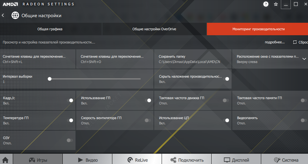 Сейчас AMD Radeon Settings отображает количество кадров в секунду, использование видеокарты, процессора и другие. Все параметры можно настраивать прямо в игре используя горячие клавиши: Alt+R, а сочетание Ctrl+Shift+O включает наложение.