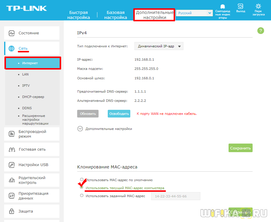 Чтобы клонировать MAC адрес с компьютера на маршрутизатор TP-Link, нужно зайти в основном меню в «Дополнительные настройки». И далее открыть рубрику «Сеть — Интернет». Здесь во втором блоке мы увидим интересующие нас конфигурации. Ставим флажок на пункте «Использовать текущий MAC-адрес компьютера» и жмем на кнопку «Сохранить».