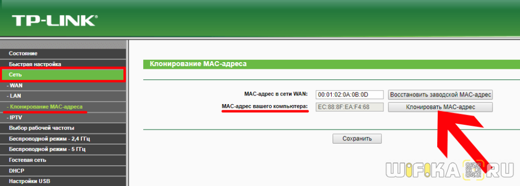 Если на вашем роутере TP-Link панель управления старого образца, то в ней открываем раздел «Сеть — Клонирование MAC-адреса» и нажимаем на одноименную кнопку для копирования с компьютера.