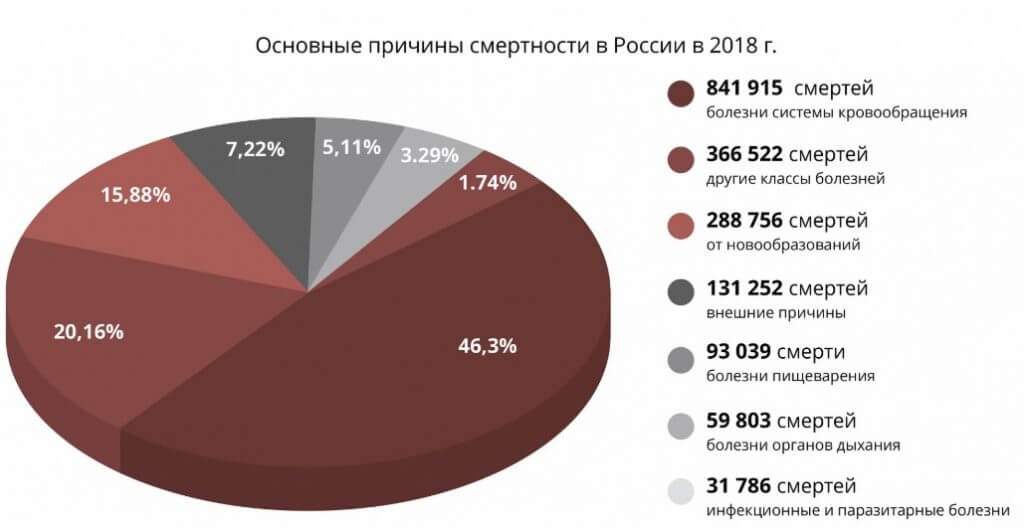 Чаще всего в 2018 году россияне умирали от болезней кровообращения. Росстат подразделяет статистику по кровообращению на ишемические болезни сердца ‒ 28,4 % и цереброваскулярные болезни (в том числе инсульт) ‒ 14,4 % всех смертей.