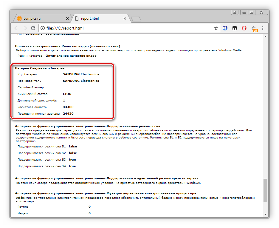 Что касается емкости аккумулятора, то нужно прокрутить документ вниз и найти раздел «Батарея: Сведения о батареи». Там будут две строчки – расчетная емкость и последняя полная зарядка. У меня почему-то показывает 24154 в обоих пунктах. Это неверно, потому что второй пункт должен быть явно ниже. У вас же может быть иначе.