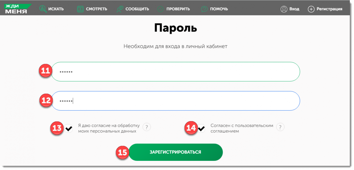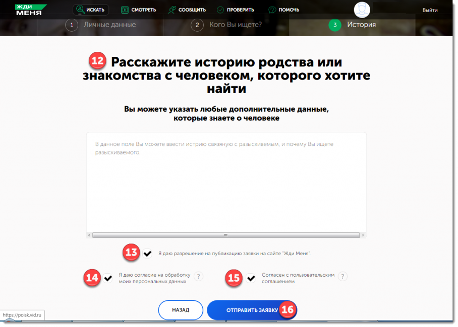 В конце следует дать согласие на публикацию заявки на сайте «Жди меня» и обработку персональных данных.