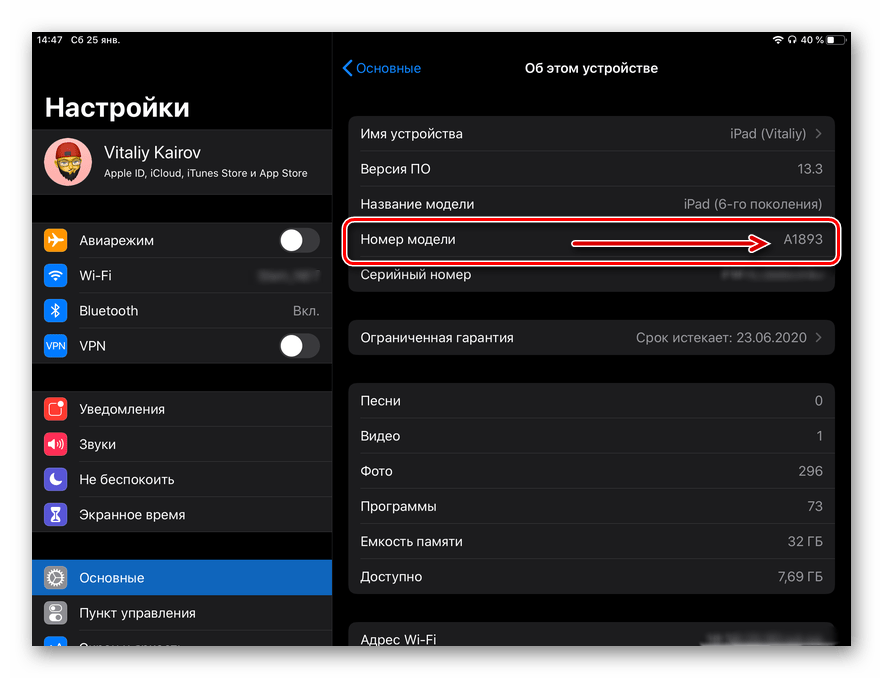 Выполните действия, аналогичные таковым в одноименном разделе предыдущей части статьи, только в этот раз обратите внимание на следующую строку – «Номер модели». Изначально в ней указана не самая очевидная информация – для получения значения, которое используется в качестве основного идентификатора iPad, просто коснитесь этой строки справа
