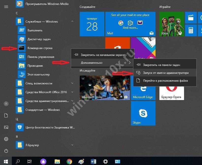 Выполняем запуск командной строки, делать это обязательно необходимо от имени Администратора. Расположена она в «Пуске». Раскрываем вкладку «Служебные Windows», находим командную строку. Жмем на ней правой кнопкой мыши и выбираем «Дополнительно». Выбираем «Запустить от имени Администратора». Или можно проще, в строке поиска введите «cmd». Сверху появится черный прямоугольник с названием командная строка. Жмем на неё.