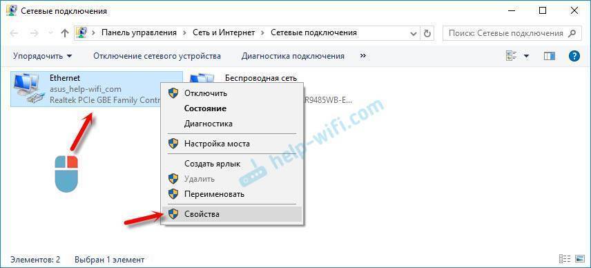 Если подключение по Wi-Fi, то нажимаем правой кнопкой мыши на “Беспроводная сеть” (Беспроводное сетевое соединение). Если же подключение по кабелю, то нажимаем на “Ethernet” (Подключение по локальной сети). Выбираем “Свойства”.
