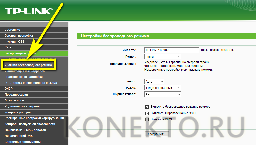 - В открывшемся окне необходимо пройти поочередно открыть – «Беспроводной режим», «Защита беспроводного режима».