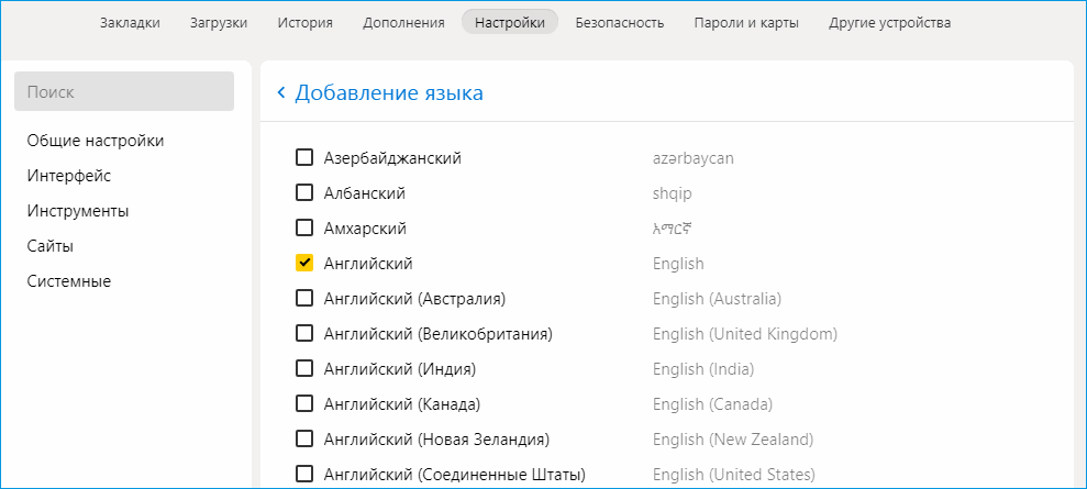 Этот пункт нам и понадобится. На выбор возможна установка нескольких языков. В зависимости от потребности самого пользователя и от характера его работы в программе-обозревателе. Необязательно привязывать браузер к одному определённому языку. В случае необходимости возможно выбрать не только Английский или Русский варианты. Дополнительные языковые пакеты загружаются из интернета и без особых проблем включаются в пользование браузера.