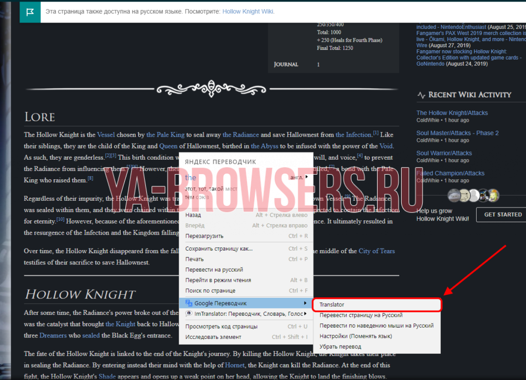 Важно: после того, как галочка будет поставлена, страницу с иностранным языком следует обновить, после чего необходимая иконка добавится на страницу и автоматический перевод будет активирован. В случае если необходимо перевести отдельное предложение или слово, то нужно выделить его и щелкнуть правой кнопкой мыши