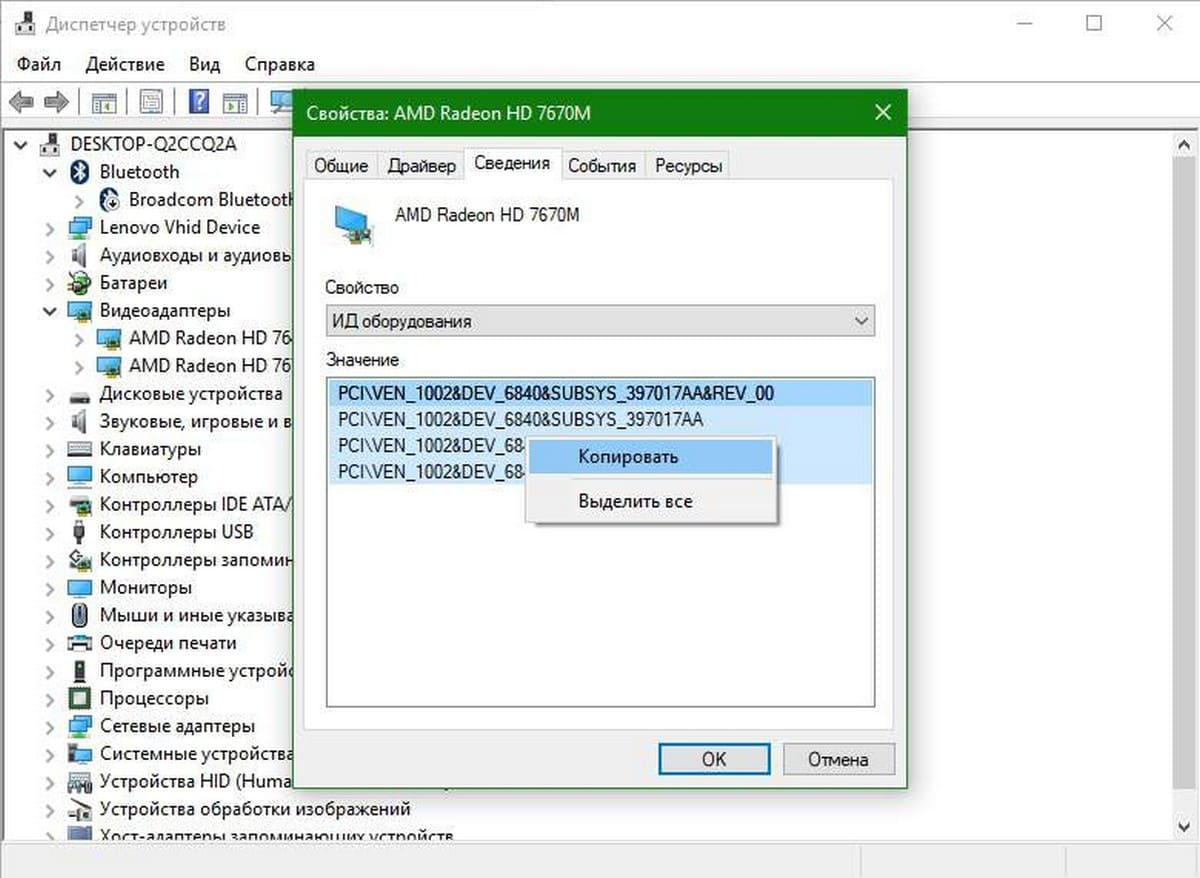 Данное действие покажет вам уникальные аппаратные идентификаторы целевого устройства. Выберите все указанные идентификаторы, кликните правой кнопкой мыши и выберите опцию «Копировать».