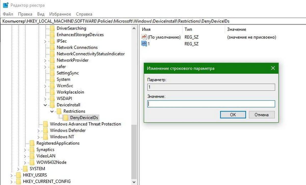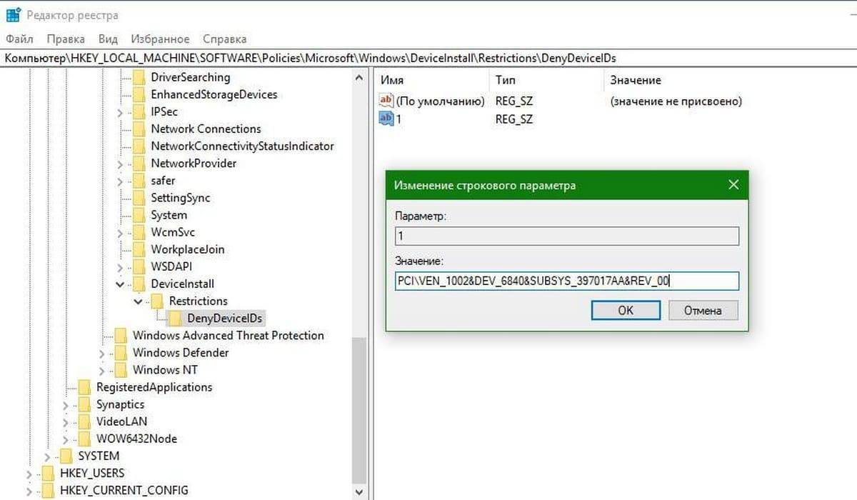 Запрет установки драйвера для конкретного устройства с помощью редактора реестра