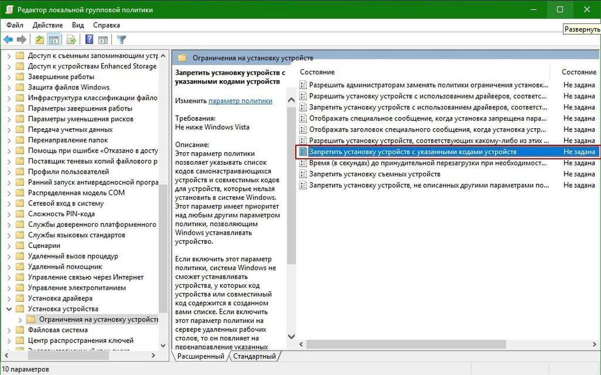 Запретить установку устройств, не описанных другими параметрами политики / кликабельно