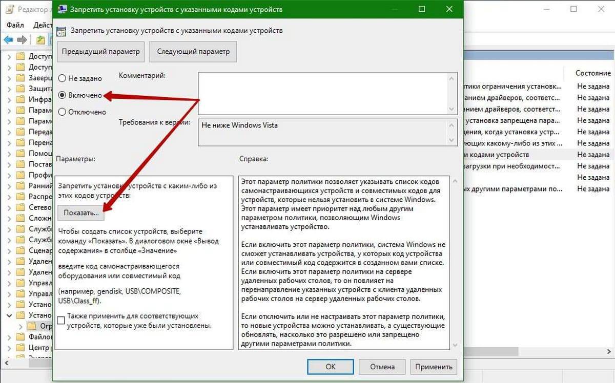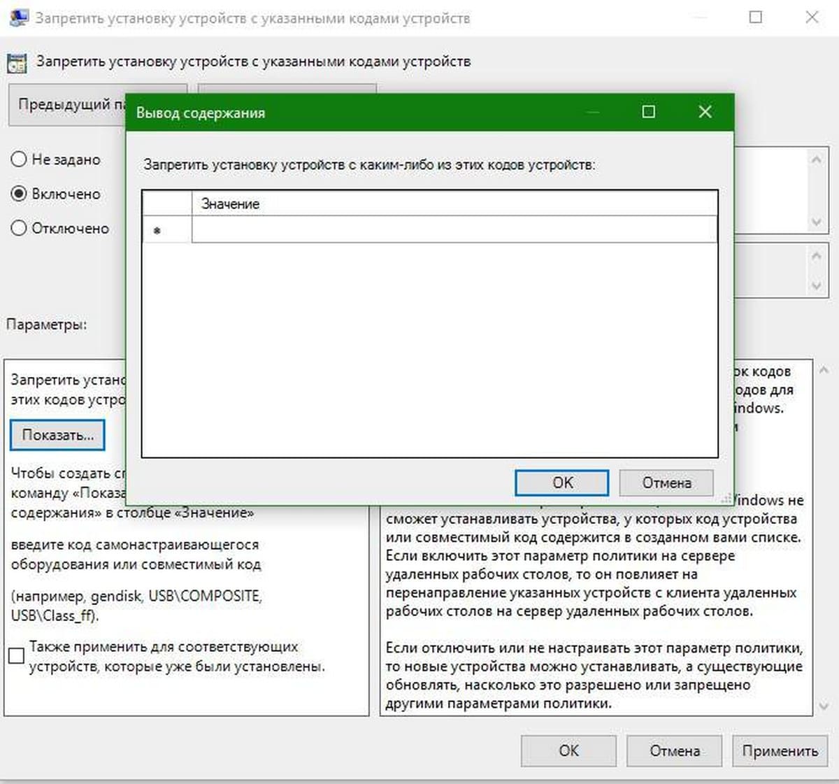 Примечание : если этот параметр политики включен, то системе Windows нельзя устанавливать или обновлять драйверы устройств, не указанных в параметрах политики «Разрешить установку устройств, соответствующих этим кодам устройств».