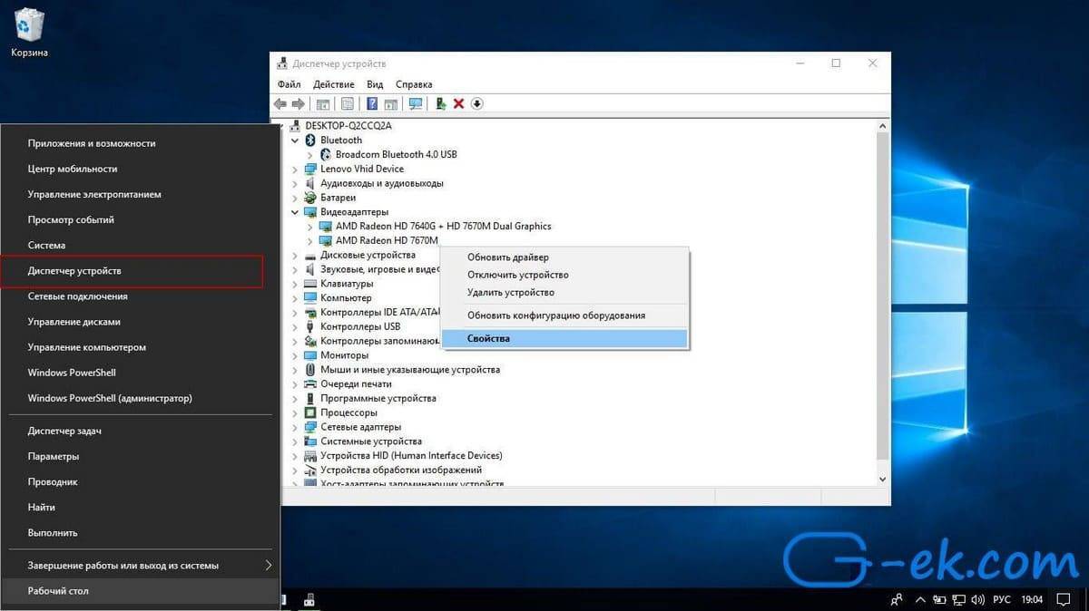 - Наводим курсор мыши на кнопку «Пуск» и вызываем контекстное меню. Нас интересует «Диспетчер устройств».