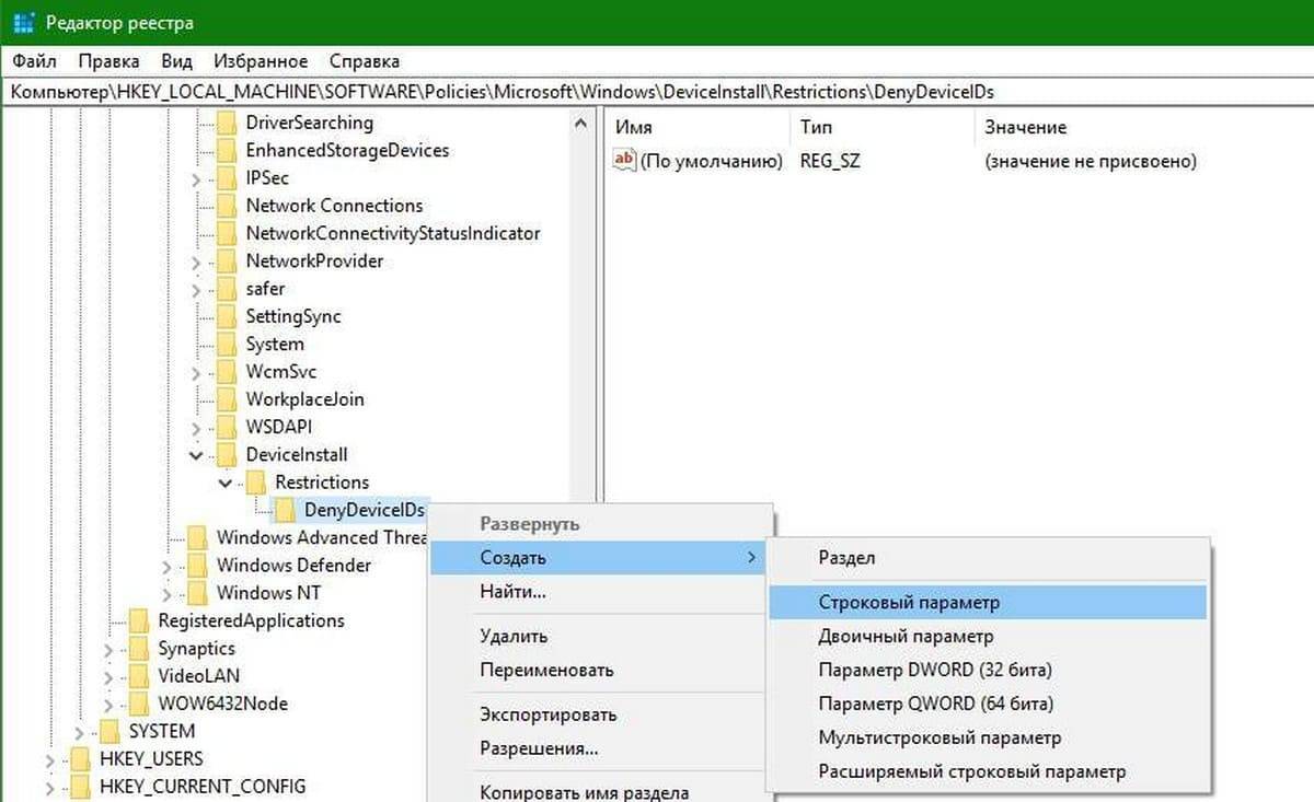 - В итоге нам нужен «DenyDeviceIDs». Если такой директории нет, ее необходимо создать.