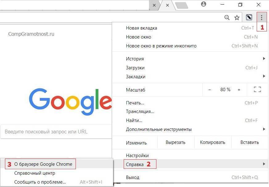 1 на рис. 2 – кликаем по значку с тремя вертикальными точками «Настройка и управление Google Chrome»; 2 на рис. 2 – открываем опцию «Справка»; 3 на рис. 2 – щелкаем «О браузере Google Chrome», после чего автоматически запускается проверка вашей версии браузера. Если имеются обновления, то они сразу же устанавливаются, без дополнительных действий с вашей стороны.