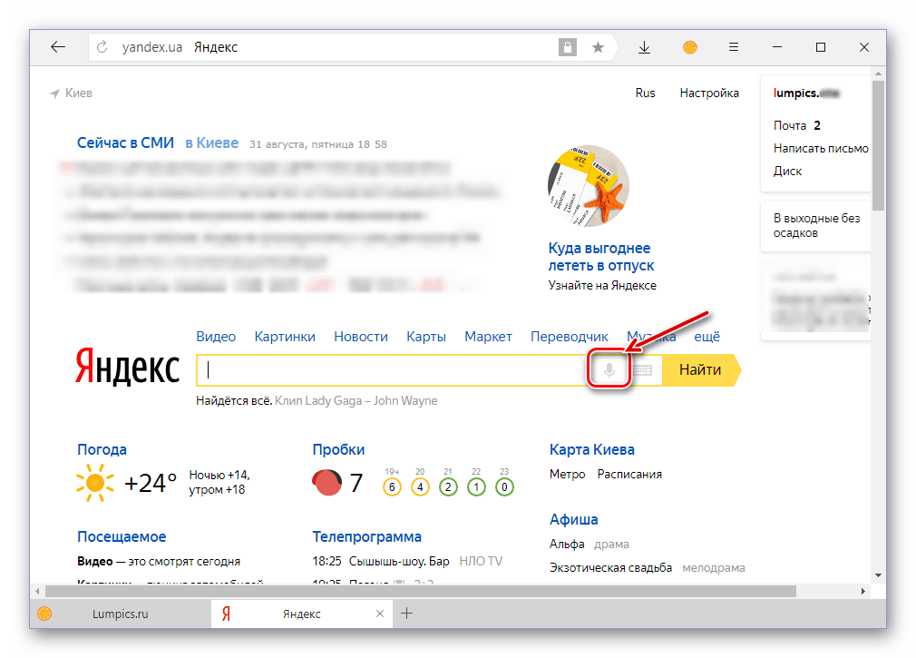 - По этой ссылке перейдите на главную Яндекса и нажмите по значку микрофона, расположенному в конце поисковой строки.