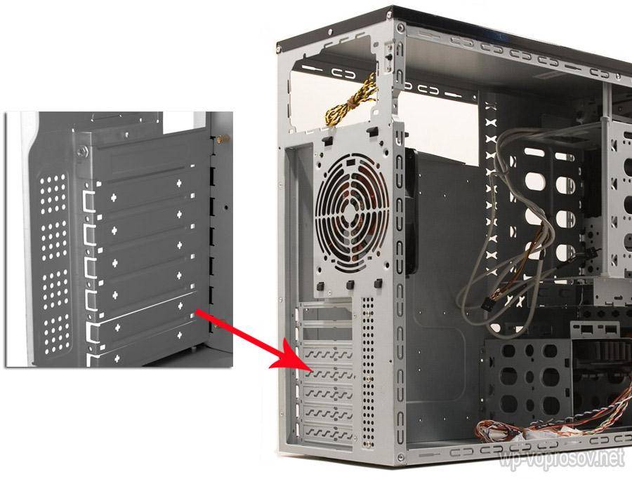 Заглушки на задней части, прикрывающие места установки карт расширения, могут быть как одноразовые, так и многоразовые. В простых корпусах это обычно металлическая пластинка, которая легко выламывается и на ее место выводятся разъемы карты (ТВ-тюнера, LAN и т.д.). Обратно ее уже вставить будет невозможно, поэтому если вы потом уберете карту расширения, то на ее месте останется пустое отверстие.