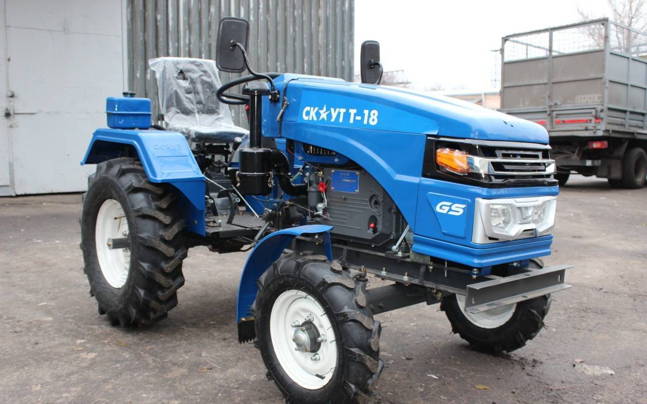 - Скаут Т-18. Небольшая техника с одноцилиндровым дизельным двигателем мощностью 18 л.с. Оборудован гидроприводом сзади и спереди для установки разного навесного оборудования. Водяное охлаждение препятствует перегреву, для увеличения сцепления с землей в комплекте идут противовесы. Ведущая ось задняя, есть свет для движения в темное время. Цена составляет от 190 до 200 тысяч.