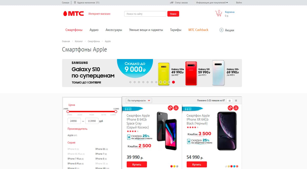 Российский онлайн ритейлер МТС предлагает смартфоны, планшеты (Apple, Huawei), чехлы для смартфонов, VR очки, а также услуги связи (мобильная, интернет, спутниковое ТВ). Приобрести любой iPhone можно в онлайн-магазине с несгораемым кэшбеком на покупку. Используйте его на оплату мобильной связи или скидку до 100% на приобретение другого товара в МТС.