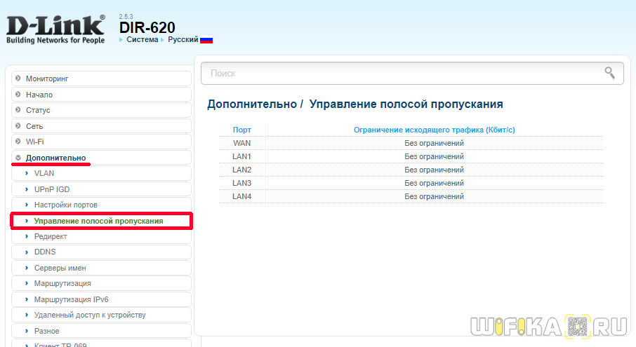 Для роутера D-Link в модель DIR-620 разработчики почему-то реализовали возможность установить QOS ограничения по скорости только на компьютеры, подключенные по кабелю к одному из LAN портов. Находится эта настройка в разделе «Дополнительно — Управление полосой пропускания»