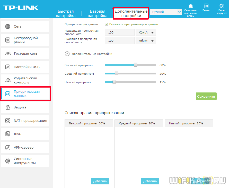 Недавно у TP-Link появилась новая визуализация панели администратора, которая устанавливается на все новые модели. В ней планировщик QoS находится в «Дополнительных настройках» в разделе «Приоретизация данных». Включаем ее галочкой и регулируем ползунками три вида приоритетов: