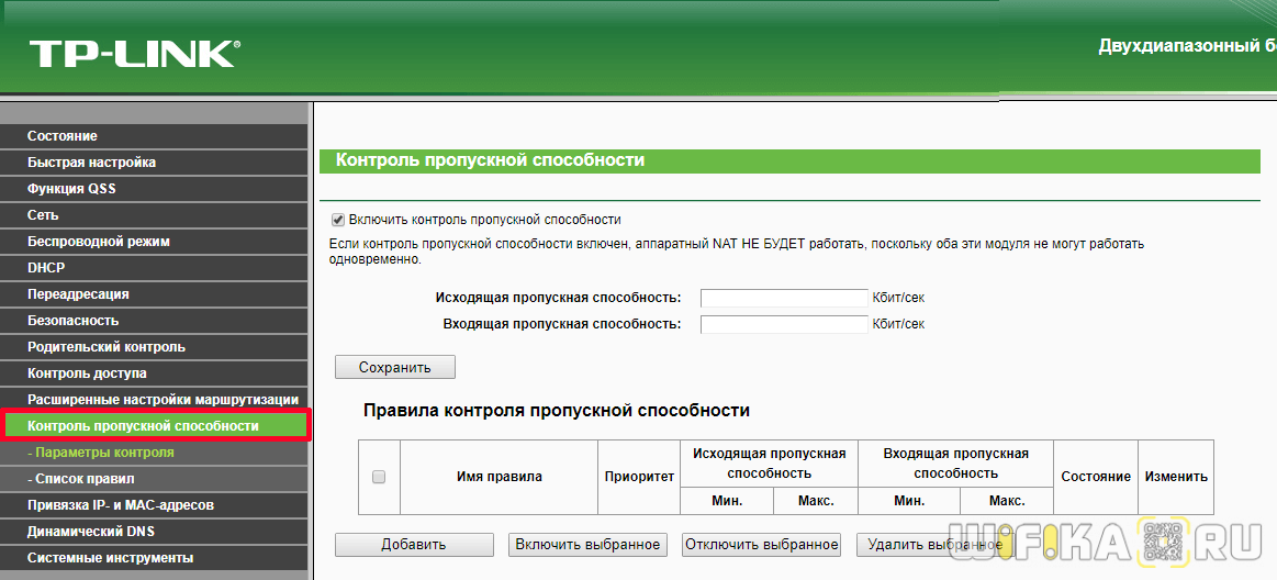 На роутерах TP-Link планировщик пакетов QoS находится в разделе меню «Контроль пропускной способности». Для его активации ставим галочку на «Включить контроль полосы пропускания» и задаем максимальную скорость для входящего и исходящего трафика.