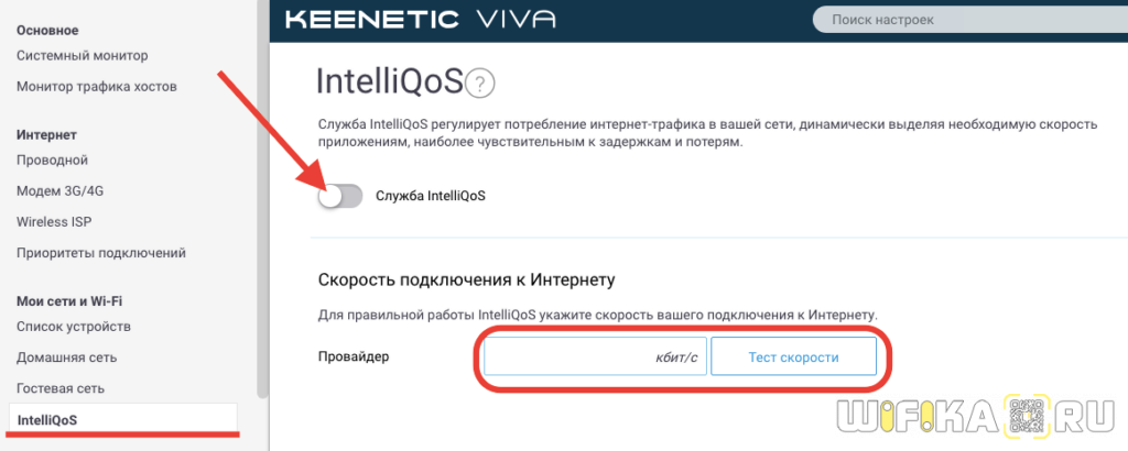 На маршрутизаторах Keenetic функция управления пропускной способностью сети называется IntelliQoS. Изначально данный модуль не присутствует в прошивке. Необходимо дополнительно установить компонент IntelliQoS из соответствующего раздела панели администратора. После чего в меню «Мои сети и WiFi» появится отдельный одноименный пункт.