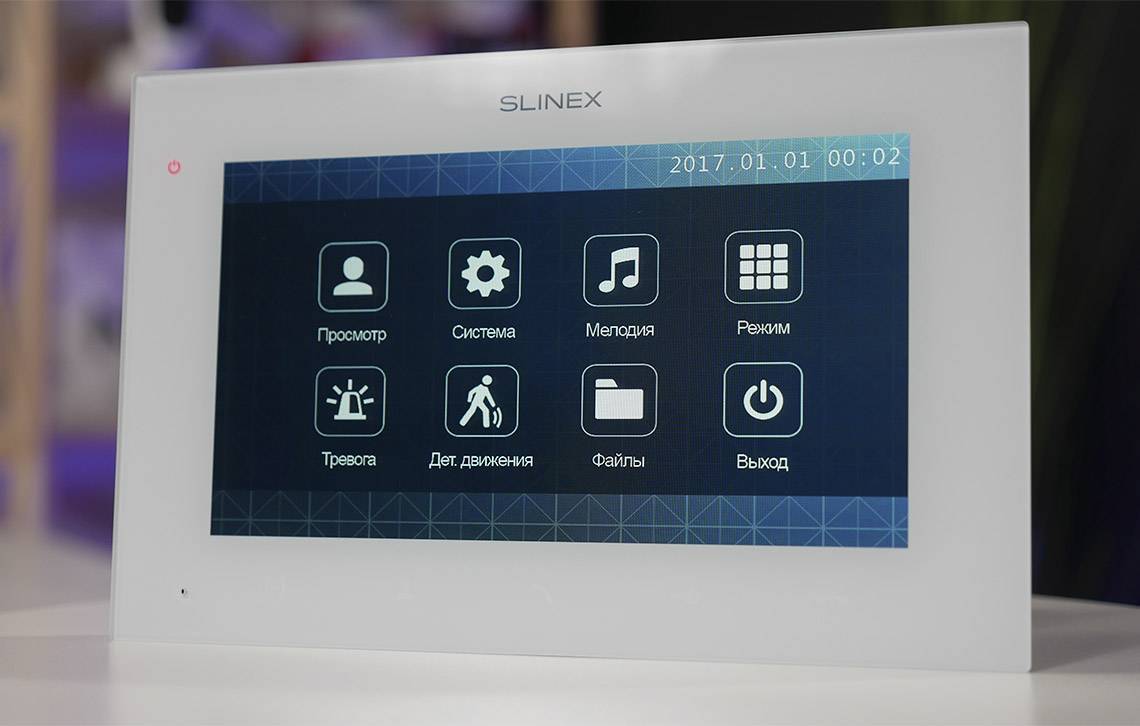 - Slinex SQ-04. Элегантный дизайн. 2 цвета, бескамерный. Часы на мониторе показывают время в режиме ожидания. Типичный аппарат средней цены.