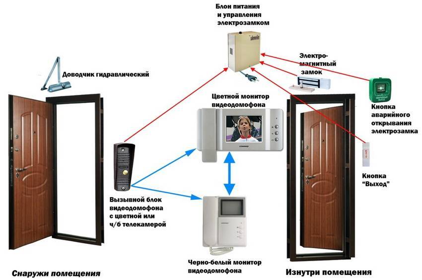 В первом случае дверь фиксируется в закрытом состоянии с помощью сильного электромагнита, который магнитным полем «держит» прикреплённую к дверному полотну пластину. Нажав на кнопку внутреннего блока можно на короткое время снять напряжение. Магнитное поле исчезнет, дверь разблокируется, и в квартиру можно будет войти. Электромеханический замок, как и обычные замки, имеет ригели, утопленные в пазы. Нажатие кнопки подаёт напряжение на электромагнит, который выдвигает ригели из пазов. Замок этого типа так же открывается с помощью электронного ключа.