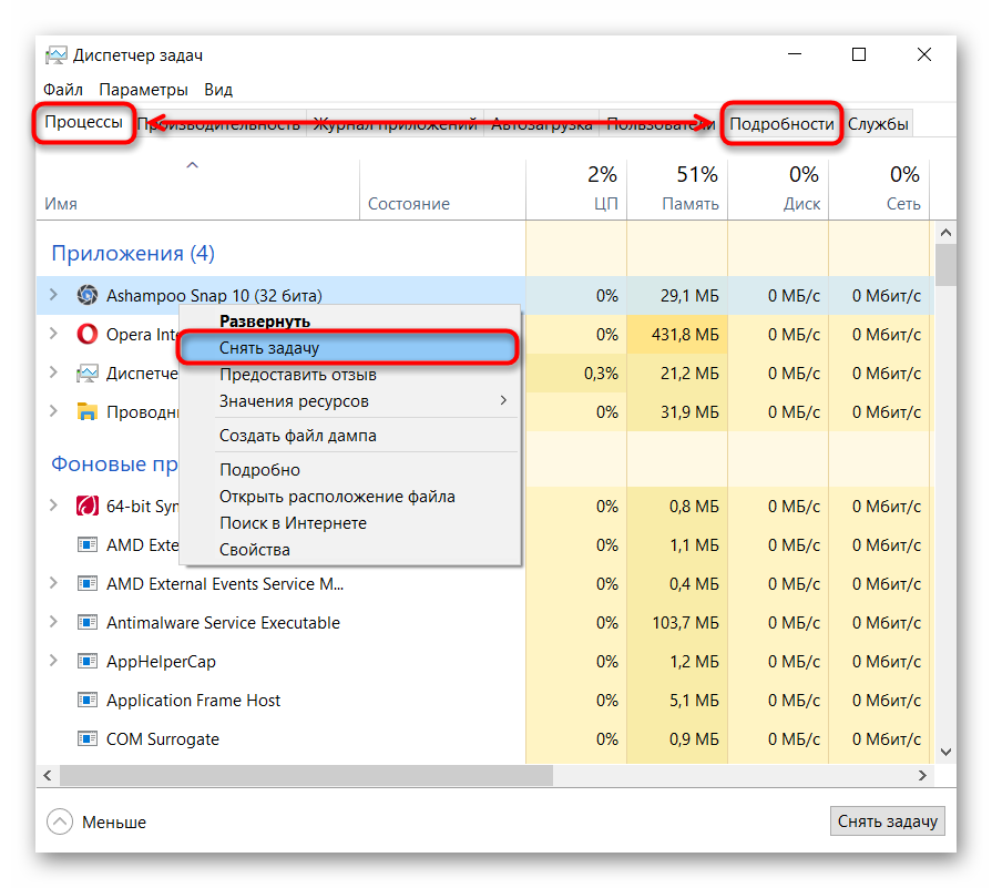 Если зависла какая-то программа, выключать ноутбук не обязательно, можно просто принудительно выгрузить виновника ситуации. Для этого на вкладке «Подробности» или «Процессы» (в зависимости от версии Windows) найдите зависшее приложение, кликните по нему правой кнопкой мыши и выберите пункт «Снять задачу» (так же может помочь пункт «Завершить дерево процессов», что есть только на вкладке «Подробности»).