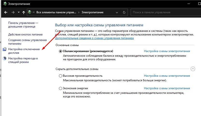 Кликните ЛКМ по надписи «Настройка отключения дисплея» (располагается в правой части окна).