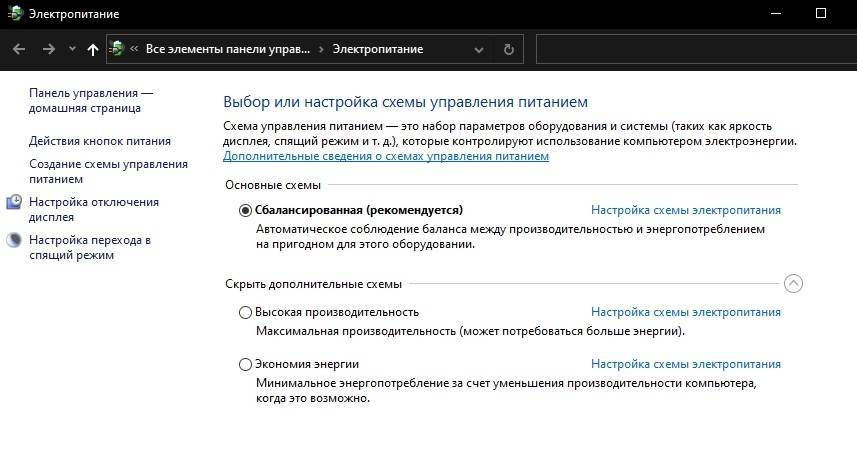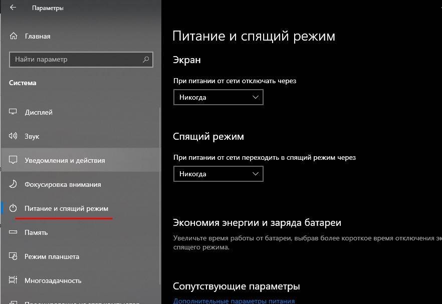 Настройки управления питанием Windows 10