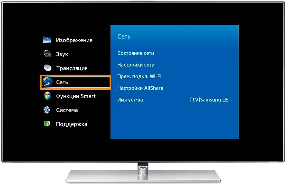 Установить Wi-Fi соединение на телевизоре можно в настройках ТВ через раздел «Сеть». В зависимости от модели плазмы название раздела может отличаться. Далее необходимо активировать сетевой адаптер и из доступных точек осуществить подключение к нужному роутеру.