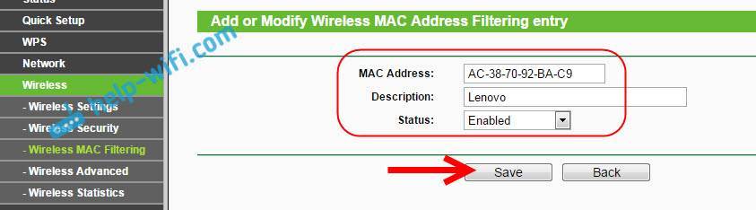 В поле MAC Address прописываем адрес устройства, которое хотим заблокировать.