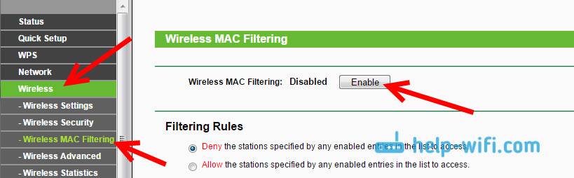 Уже по стандартной схеме, заходим в настройки своего Tp-Link. Переходим на вкладку Wireless – Wireless MAC Filtering. Нажимаем на кнопку Enable, что бы включить фильтрацию.