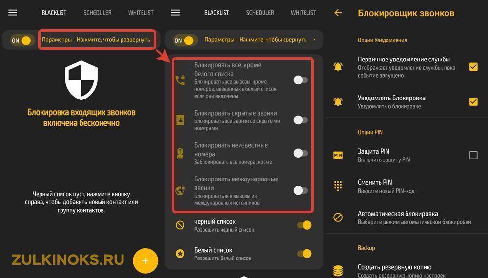 «Блокировщик звонков» – Современный софт от компании Fiorenza Francesco с тёмной темой. Требует неограниченное использование аккумулятора в спящем режиме. Может работать по расписанию – есть планировщик. Базовые настройки аналогичны предыдущей программе: скрытые, незнакомые, международные вызовы.