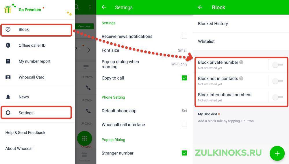 - блокировка скрытых номеров, заграничных, отрицательно оцененных пользователем, отсутствующих в телефонной книге;