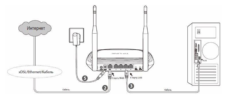 После того, как место удачно или неудачно выбрано, нам надо вставить все нужные кабели по своим местам. В этом ничего сложного, просто подключить питание, затем подключить интернет в соответствующий WLAN порт, и подключить ПК к маршрутизатору через один из 4 LAN портов.