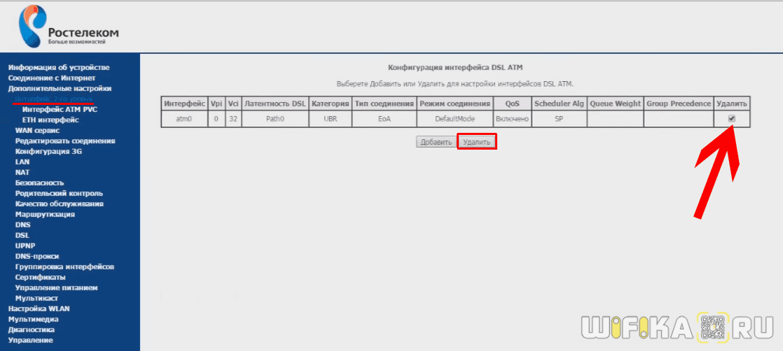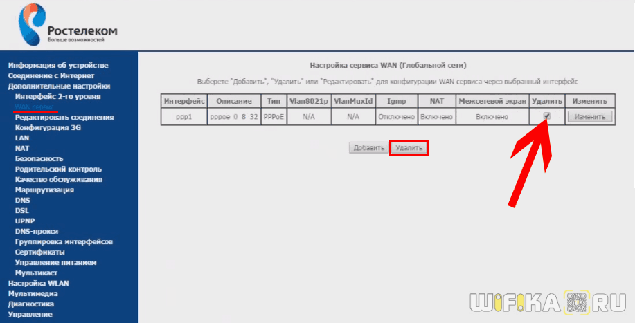 Теперь заходим в раздел «Дополнительные настройки — WAN-сервис» и смотрим, если здесь таблица с заполненными строками. Если есть, то ставим галочку на «Удалить» и жмем на одноименную кнопку.