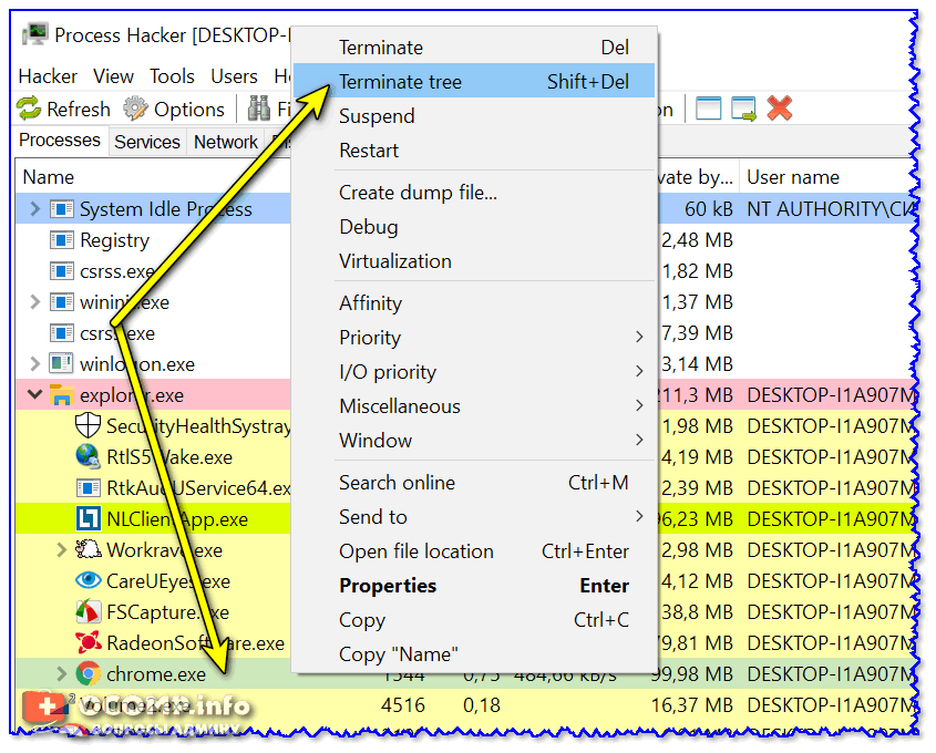 Чтобы ликвидировать (закрыть) в нем любую из запущенных программ — нужно просто ее выбрать в списке, затем нажать ПКМ по ее имени и в появившемся окне выбрать “Terminate tree” (см. пример ниже ).